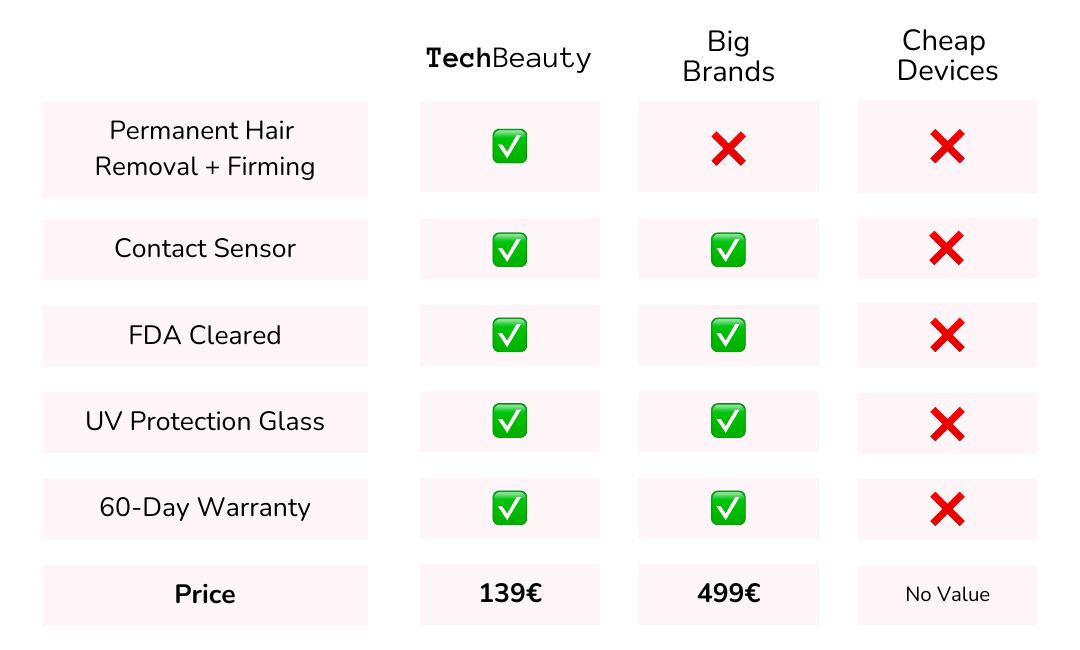 Results ? Smooth , hair-free skin after just a few sessions ! And to convince you even more, TechBeauty offers a money-back guarantee if you don't see satisfactory results 💵