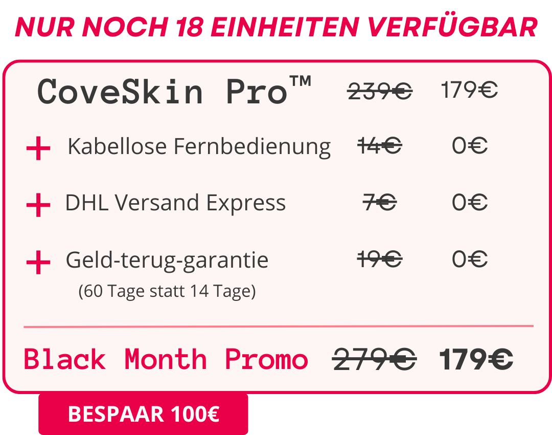 Ja, der CoveSkin Pro ist als medizinisches Gerät zugelassen. Er wird durch hunderte unabhängige Studien unterstützt und wurde entwickelt, um sicher und effektiv zu sein, wenn er gemäß den Anweisungen verwendet wird.